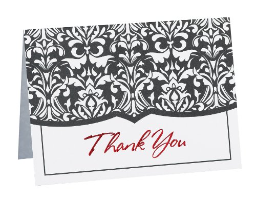 - Printed with a beautiful black damask design in black, and the words Thank You in red foil