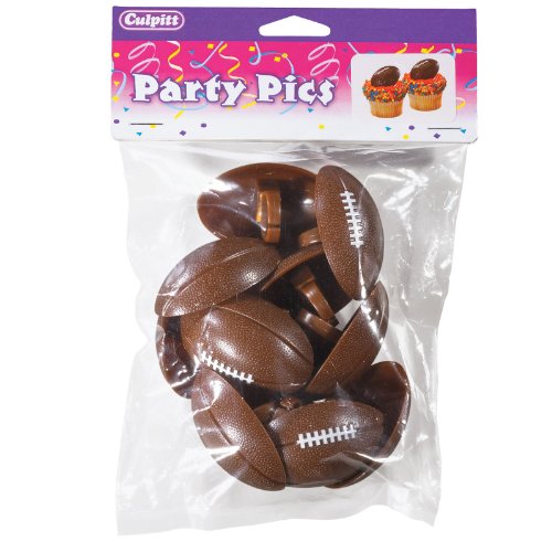 Set of 12 plastic cupcake rings in all shaped like footballs. Cupcake rings are used as a cupcake topper and then can be worn as a ring. They can also be used with cakes and other served dishes at parties.
